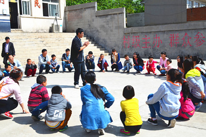 韩杖子小学一年级和二年级各有一个班级,共计34名贫困学生。走访党员队伍受到了孩子们的热情接待,并在韩校长的带领下,参观了学生上课的简陋教室和与村委会共用的操场。随后,王思琪等四名学生党员分别为孩子们开展了精心准备的课程,其它学生党员为孩子们建立起了校园“读书角”。之后的活动中,学生党员与孩子们自发结成一对一小组,通过“击鼓传花”和“你比我猜”两个比赛进行了互动,这不仅增强了孩子们的竞争意识和合作精神,更让他们感受到大学生哥哥姐姐们的温暖和关爱。在一对一的心灵沟通后,毕业生党员将支部内42名党员们自发交纳的特殊党费800余元所购买的书包、铅笔、橡皮、尺子和笔记本等学习用品赠予对方。活动结束后,学生党员与孩子们合唱并表演手语《感恩的心》,并为同学们佩戴上红领巾,同时献上精致的祝福卡片。