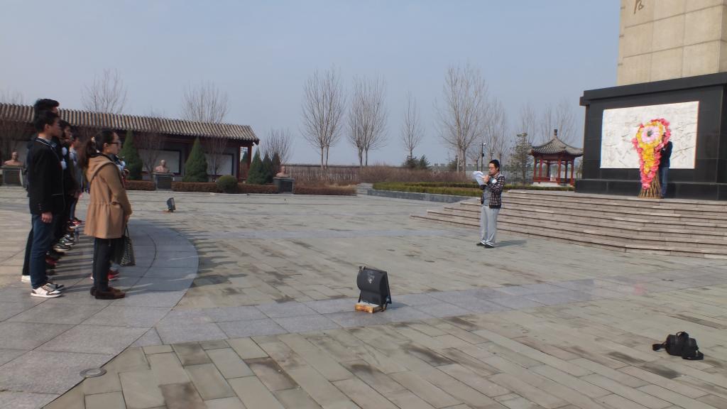 出发,历时一个小时到达位于山海关地区的秦皇岛烈士陵园。9:30分,祭奠仪式正式开始,仪式由学生会副主席闵家锐主持。在低沉、哀痛的音乐中,学生代表向英烈们敬献了花圈。随后全体同学在烈士墓前默哀三分钟,表达对革命先烈的哀思。学生代表闵家锐在仪式上发表讲话,表达了对英烈们的哀悼和敬意。最后,同学们在烈士墓前进行了庄严宣誓。宣誓完毕,大家肃穆敬仰的烈士墓绕行一周,将胸前佩戴的白花依次敬献给了英烈们,以示悼念与缅怀。
