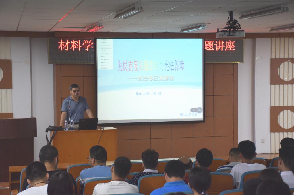 邀请校党委讲师团成员、校纪委副书记、监察审计处处长张明教授,在电院101室作了《为民族复兴提供有力宪法保障——宪法修正案解读》的专题讲座。讲座由亚博体育