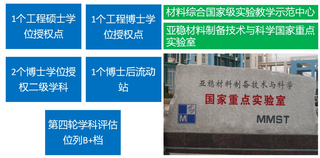 拥有材料科学与工程1个博士学位授权一级学科,1个博士后流动站,2个博士学位授权二级学科,1个工程博士专业学位授权点,1个工程硕士授权领域。