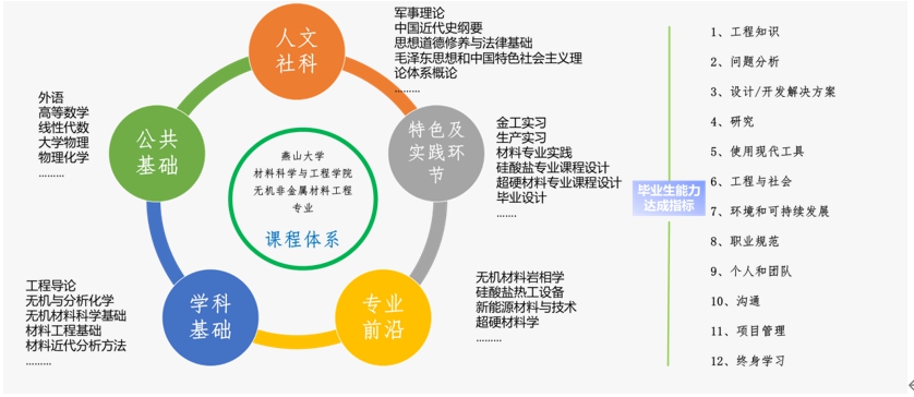 师资队伍科研基础与特色,确定了2个专业培养方向,开设相关公共基础和专业特色课程。课程体系由人文社科、公共基础、学科基础、专业前沿和特色及实践环节等教学模块组成,专业课程划分为超硬材料和硅酸盐2个专业方向模块,教学上强化基础知识的掌握,高度重视创新能力的提升,促进多学科的交叉融合,加强最新科研与教学的联系,及时反映无机非金属领域的最新研究进展,全面提升学生的综合素质和创新能力。