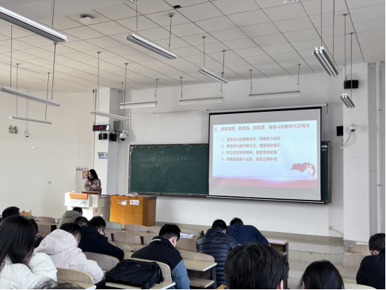 王亦晨老师以党的二十大报告主题为切入点,以习近平总书记在党的二十大上的报告中对广大青年提出的“立志做有理想、敢担当、能吃苦、肯奋斗的新时代好青年”重要要求为中心,通过讲述青年始终是实现中华民族伟大复兴的先锋力量;新征程上,青年的使命与担当;做有理想、敢担当、能吃苦、肯奋斗的新时代好青年三部分内容,激励作为新征程上的青年,要深刻认识自身所肩负的时代使命,增强历史主动精神,达到高度自觉。希望广大青年:首先要有坚定远大的理想信念,明确奋斗目标;其次要勇担时代赋予的大任,增强使命意识;第三要树立吃苦耐劳精神,激发劳动欲望;最后还要培育团结奋斗品质,练就过硬本领。作为新时代中国青年,在享受着优越的物质条件,可以做出更多的个人选择之时,一定要坚定理想信念、勇担时代大任、树立吃苦耐劳精神、培育团结奋进品质。