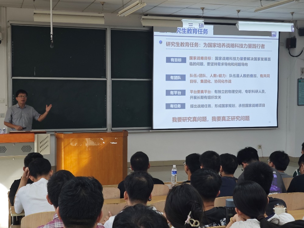 研究生教育的定位与任务。强调了研究生教育不仅是知识的传授,更是科研能力和创新思维的培养。他要求新生们树立远大目标,将个人发展与国家需求紧密结合,努力成为具有创新精神和实践能力的高层次人才。