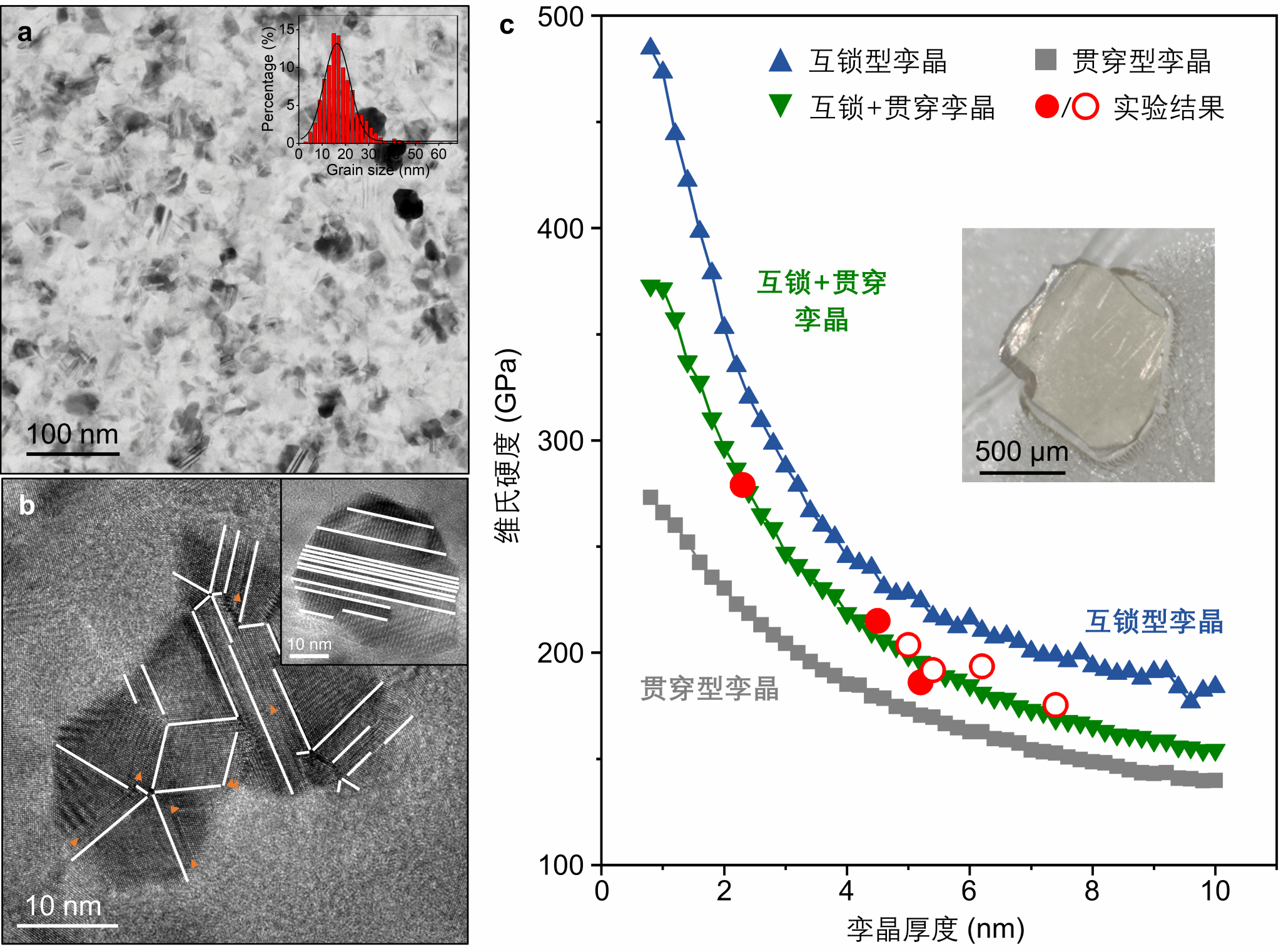 图释:超细纳米孪晶金刚石的显微组织结构和维氏硬度。a) STEM明场像展示了样品的整体微观形貌,插图为统计获得的晶粒尺寸分布,平均晶粒尺寸为18 nm。b) 高分辨TEM照片显示了样品中的特征孪晶结构:主图为占主导地位的互锁型孪晶,插图为局部区域观察到的贯穿型孪晶。c) 基于位错模型计算的硬度随孪晶厚度的变化及实验测得的硬度数据,插图为超细纳米孪晶金刚石样品的光学照片。