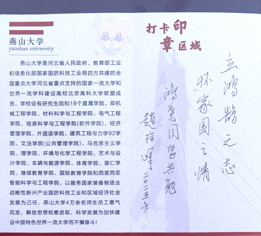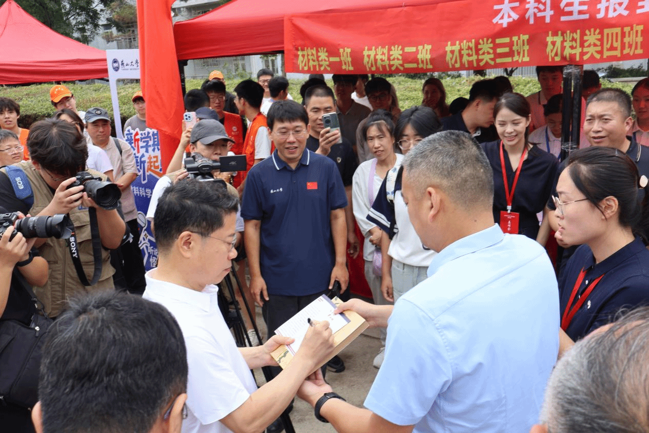 校、院领导来到迎新现场,与新生及家长亲切交流,仔细询问报到情况,耐心叮嘱全体新生尽快适应校园生活、融入集体环境,在材料学科领域扎实求知、探索创新,开启新的成长旅程。校党委书记赵险峰在报到现场题下“立鸿鹄之志,怀家国情怀”,以此寄语2025级本科生李鸿尧同学,更借此向全体新生传递殷切期望,鼓励大家在新的求学阶段树立远大理想、涵养家国担当,以青春之力在专业领域深耕,不负时代与韶华。