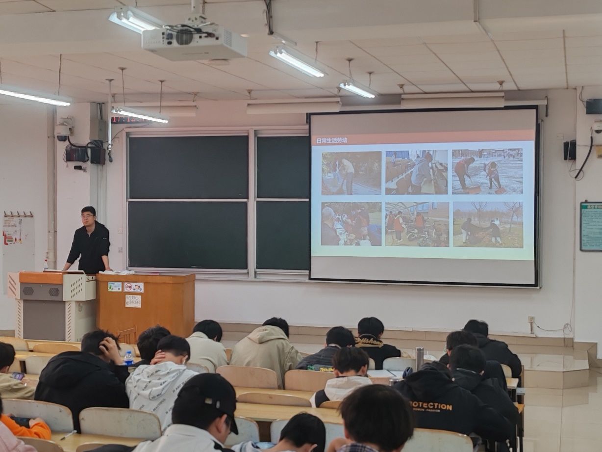 班会上,辅导员以“劳动何以育人”为切入点,结合《关于全面加强新时代大中小学劳动教育的意见》文件精神,系统阐释劳动教育的时代内涵。他指出,劳动教育不仅是体力与技能的锻炼,更是价值观的塑造过程。“劳动是成长的必修课,是连接知识与实践的桥梁。从个人生活自理到服务集体、奉献社会,每一份劳动都在培养责任感、协作力与创造力。”通过分享“最美钳工”张文良、尹景波:我送“胖五”上青天等榜样事迹,他强调劳动精神是青年成长的根基,唯有在劳动中感悟“实干兴邦”的真谛,才能成为有担当、有韧性的新时代建设者。