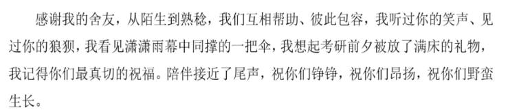 致谢的字里行间,同窗情谊如美玉般温润动人。是“陪我疯狂”的伙伴,是四年包容的温暖。熬夜实验的灯火、考研时的礼物、雨幕中同撑的伞,皆成青春珍忆。同窗们用四年的陪伴,在燕园织就了一幅名为“青春”的锦缎。