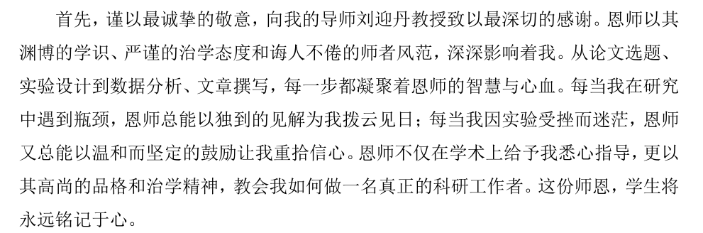 致谢里,导师们是最耀眼的星辰。“高山仰止”的学识与严谨治学的态度,从课题选定的探讨到实验数据的反复雕琢,为学子搭建科学阶梯。一条条的论文批注里,既有学术规范的苛求,也有成长的温柔期许。“实验室受挫时的温和鼓励”,是学子心底最暖的光。这些凝结着导师心血的瞬间,早已成为学子科研道路上永不熄灭的灯塔。