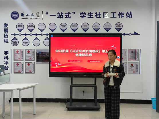 当务中心事务部部长闫若佳带领支部党员专题学习《习近平谈治国理政》第五卷。作为集中展现马克思主义中国化时代化最新成果的权威著作,该书蕴含的关于新时代党的建设的新思想、新观点、新论断,为支部党员加强党性修养、坚定理想信念提供了根本遵循。学习过程中,党员们结合书中要义,围绕“如何以党的创新理论指导学业科研”展开初步探讨,为后续交流奠定理论基础。