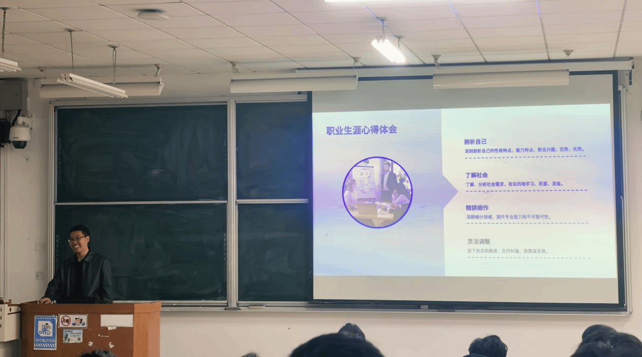 活动尾声,李艺君老师总结指出,刘瑾师兄的分享展现了跨专业发展的可能性,鼓励同学们既要立足专业,又要敢于突破,在大学生活中不断探索自我、积累能力,为未来多元发展夯实基础。