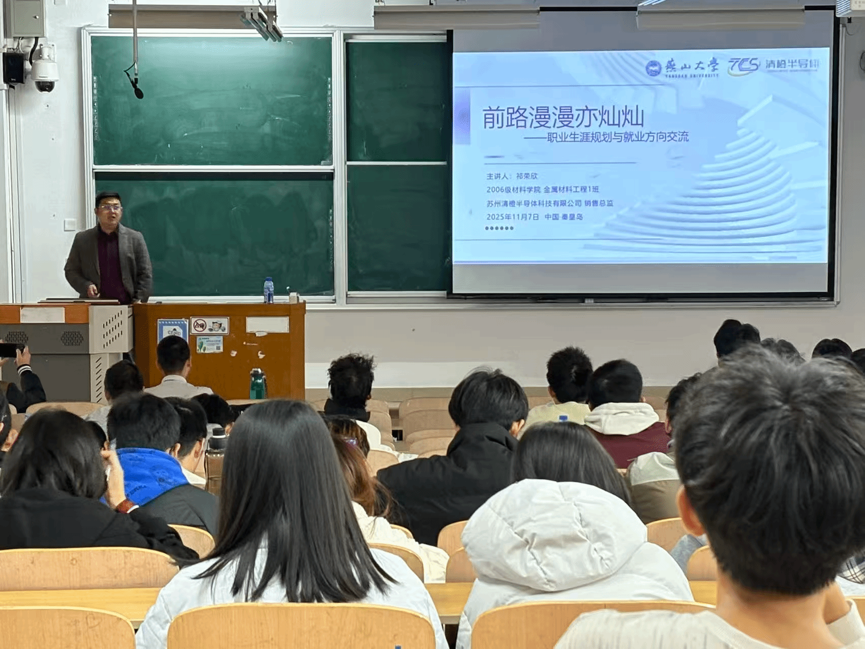 2006级金属专业校友、现任苏州清橙半导体科技有限公司销售总监祁荣欣担任主讲人,金属材料工程系主任李艺君老师主持活动。