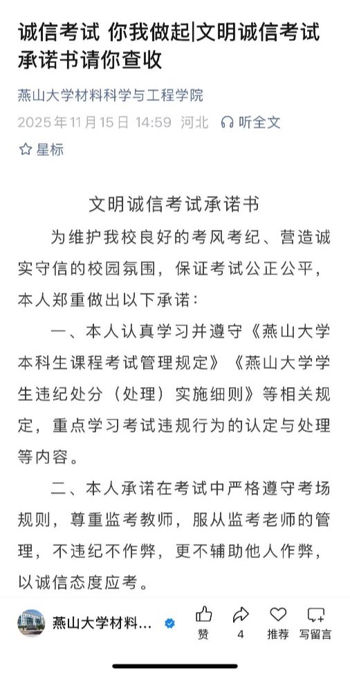 微信公众号发布“诚信考试 你我做起|文明诚信考试承诺书请你查收”推文,让学生深刻认识诚信考试的重要性,引导学生树立“诚信应考、以考促学”的正确观念,摒弃侥幸心理,以真实成绩检验学习成效。
