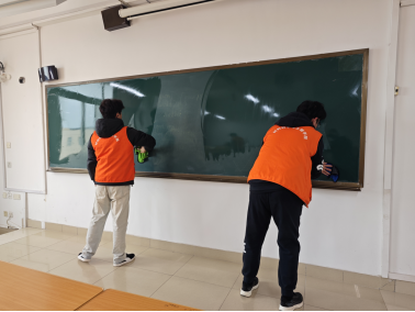 在教学楼,志愿者坚持“以劳育德、志愿为美”,细致清扫地面、擦拭黑板讲台、规整课桌椅,让一间间教室窗明几净、书香氤氲,为新学期注入清新与温度。