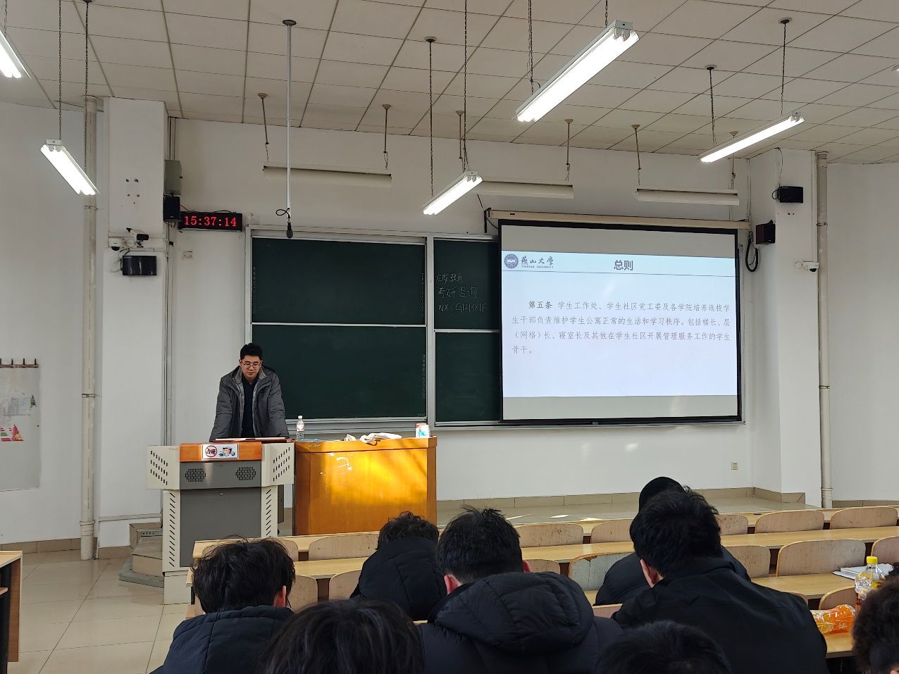 学生违纪处分(处理)实施细则》两项修订文件。他结合生活实际,对公寓管理中的住宿规范、安全管理和卫生要求进行重点解读,明确严禁私拉电线、使用违规电器、存放危险品、饲养动物、电动车入户充电等危险行为,强调学生需遵守归寝制度和请假流程,共同维护安全有序的公寓环境。针对违纪处分细则,他聚焦新增违纪追诉期、批评教育与纪律处分衔接、网络行为规范升级、校园安全管理强化、学生权益保护、勤俭节约等六大变化,详细说明了网络暴力、电信诈骗、违规使用校园车辆、校园欺凌、浪费资源等行为的处分标准,引导同学们知规守纪、行有所止,坚守诚信底线。