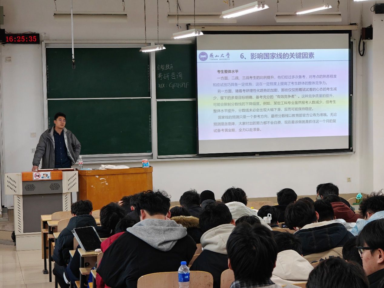 结合2023级学生备战考研的关键节点,会议特别设置考研专题指导环节。董亮系统讲解了考研核心概念、分数线划分及最新形势,清晰阐释了国家线与自主划线的区别、A区B区考生标准及分数差异。他结合近年考研数据与工学专业趋势,深入分析了招生计划、报考人数、试题难度等因素对国家线的影响,提醒同学们需总分与单科线双达标方可具备复试与调剂资格。同时,他鼓励大家立足专业优势,把握复试备考黄金期,以积极心态迎接考研挑战。