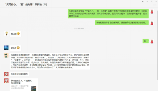 党委博士研究生第二党支部全体党员,在党支部书记赵佳莉的主持下,于2020年3月20日以微信群形式,开展了主题为“疫情防控经验分享”的主题党日活动。