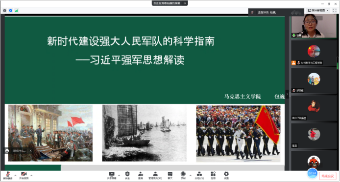包巍教授作题为《新时代建设强大人民军队的科学指南——习近平强军思想解读》的讲座。讲座从习近平强军思想的形成背景、强军之魂、强军目标和强军路径四个方面进行阐述,帮助师生党员深刻领会习近平强军思想的精神实质和丰富内涵。